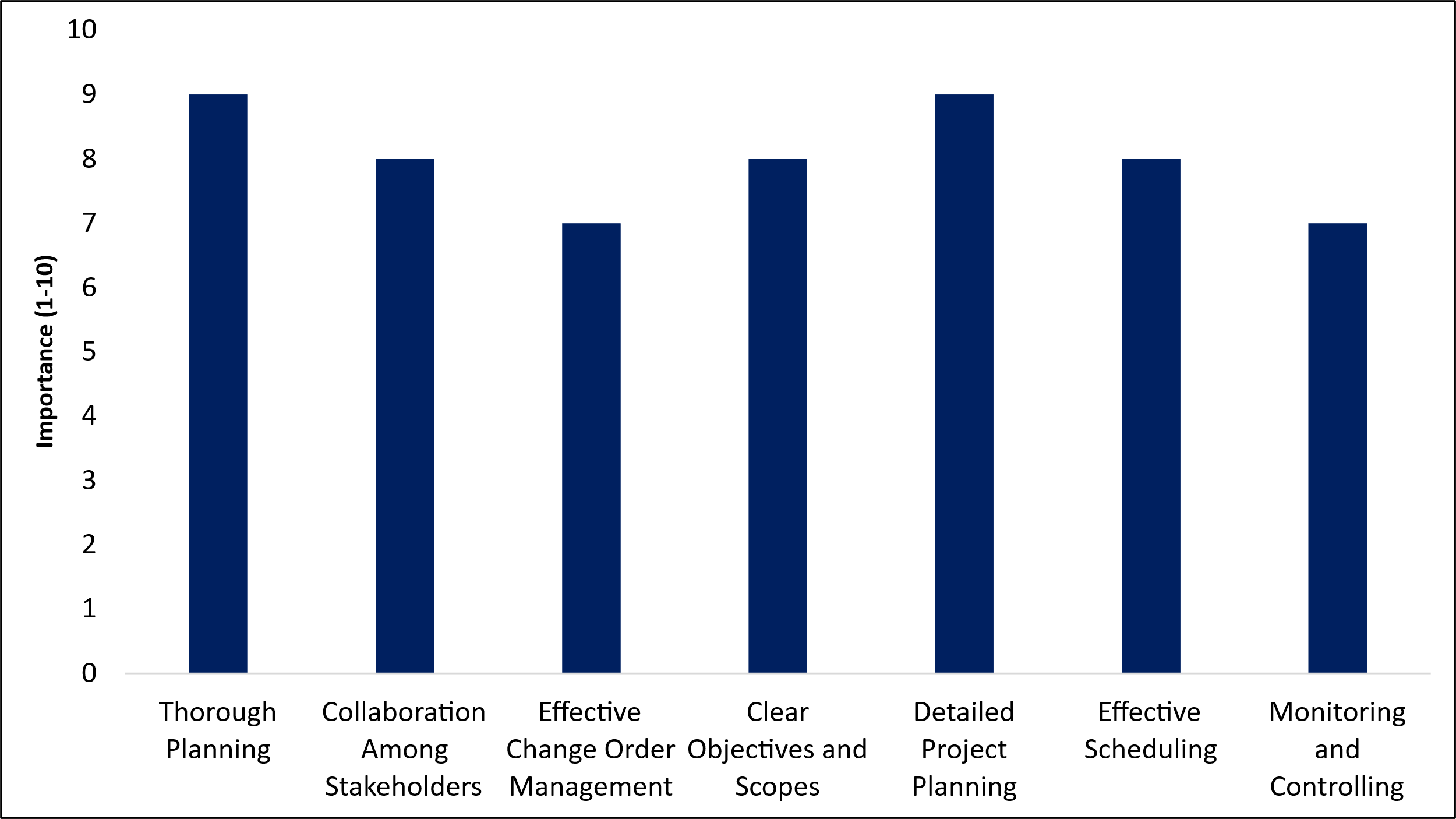 Figure 1 highlights seven critical success factors in construction project management, including planning, collaboration, change order management, and scheduling. These elements underscore the importance of integrating proactive, well-defined, and controlled practices to achieve efficient, timely, and cost-effective project outcomes.