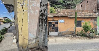In northern Peru, expansive clays have caused recurrent problems in both coastal regions and inter-Andean valleys. These areas contain soils with high plasticity and expansive clay minerals such as montmorillonite (a mineral that absorbs water between its layers and swells). Research by [2] has reported repeated structural damage to adobe and concrete buildings in Piura and Lambayeque. The situation is aggravated by extreme climatic events such as El Niño. During intense rainfall, soil becomes saturated, increasing its expansion potential and negatively affecting urban and rural structures. Figure 1a shows a vertical and diagonal crack in a wall, typical of failures caused by differential settlement on expansive soils in Sullana. Figure 1b presents another example: a vertical crack inclined at approximately 45°, about 2 mm wide, located between a door and a window. This damage originated from the vertical movement of the frame due to soil expansion or settlement.