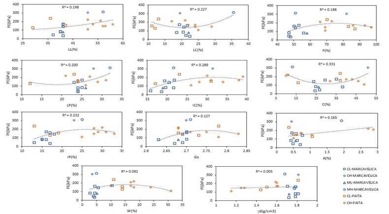 The shrinkage limit (LC) exhibits a higher relationship with PE (R²=0.227), suggesting that this parameter has a moderate impact on expansive clayey soils. On the other hand, the shrinkage index (SI) presents a somewhat higher correlation than in previous analyses (R²=0.289), indicating a more significant relationship with expansion pressure.