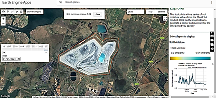The soil moisture analysis was performed from 2020 to 2024. An assessment of the water content in the surface soil was conducted. SMAP quantified the water content in the uppermost layer (5 cm) of soil. It was determined to average 0.09 cm³/cm³ due to the ashing and the associated damming required by the ashing process. The researchers choose the dam facility as their focal point on the SMAP visualization application, as illustrated in Figure 2.