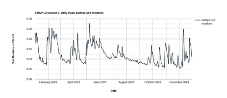 Soil Moisture Active Passive (SMAP) is a metric utilized to measure soil moisture. The SMAP project is a global orbiting observatory that quantifies the water content in surface soil. Soil moisture is an essential indicator in agriculture, drought and flood forecasting, weather forecasting, and other domains [6]. SMAP quantifies the water content in the upper 5 cm of soil over all terrestrial regions that are neither frozen nor submerged in water. Furthermore, it differentiates between frozen and thawed soil. SMAP analyzes the moisture content within the minerals, geological materials, and organic particles found in soil globally, specifically in regions where the ground remains unfrozen [8]. SMAP cannot detect ice, but it can assess liquid water in the uppermost layer of the Earth [9]. The soil's moisture content influences the emission of microwave radiation, although this energy exists in all soil types [10]. Microwave energy escalates with arid soil and diminishes with moist soil. This radiation is quantified using radiometers, enabling scientists to ascertain the water content [11]. SMAP measures radiation in the L-band microwave spectrum (30–15 cm & 1-2 GHz frequency), as this wavelength may penetrate clouds, enabling SMAP to assess soil moisture under cloudy situations [12].