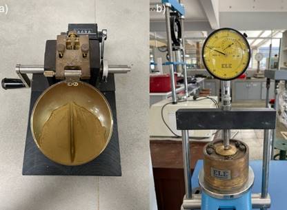 Laboratory tests were conducted on the field samples to determine the basic physical properties of the clays, such as particle size distribution, plasticity limits, specific gravity, and moisture content. According to the AASHTO classification, all samples were identified as clayey (groups A-6 and A-7), while the SUCS system categorised them mainly as clays (CL and CH) and silts (ML and MH). Figure 3 presents the liquid limit (LL) and expansivity tests performed in the laboratory.