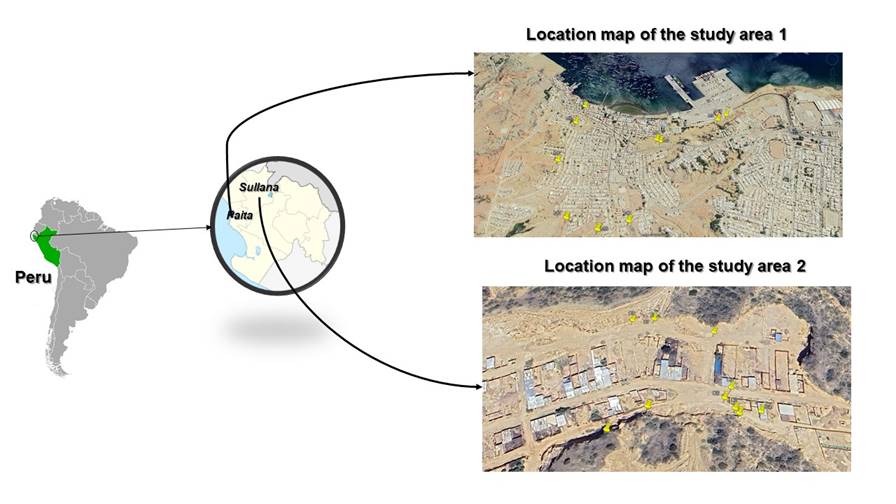 The first area is located in the Marcavelica district, Sullana, Piura, Peru. This district features a tropical arid climate with marked seasonal variations that affect soil moisture, characterised by rainfall from January to April and droughts during the rest of the year. Geological studies revealed that the area is underlain by deposits from the Cenozoic era, specifically the Neogene and the Miramar Formation, with a notable presence of clay in the soil (16.5%) and subsoil (18.9%). The selection of sampling areas in this zone was based on an expansive soil zoning map developed by [2]. To obtain representative results, 10 sampling points were delineated (M1, M2, M3, M4, M5, M6, M7, M8, M9, and M10), avoiding altered soils.