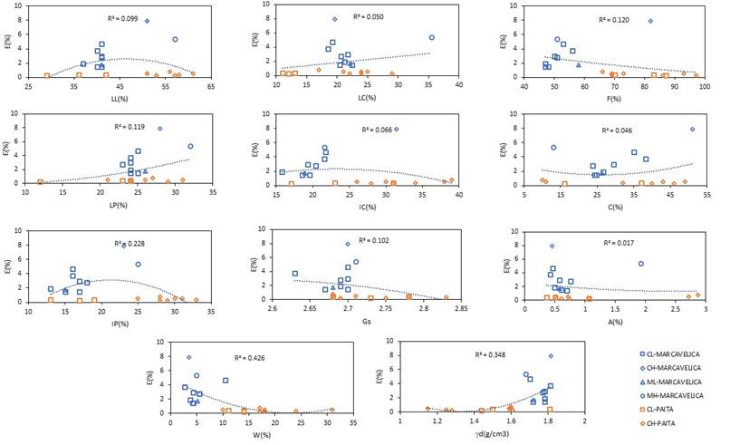 The shrinkage limit (LC) initially shows a weak relationship with the expansion percentage; however, when considering only CL samples, a moderate negative trend is observed, suggesting a complex behaviour that a parabolic curve could model. On the other hand, the shrinkage index (IC) presents a more significant positive correlation with E, especially in CH soils, emphasising the relevance of this parameter in their expansive behaviour.