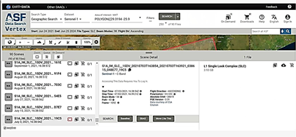 Vertex is the Alaska Satellite Facility's (ASF) data search program for remotely sensed Earth images, facilitating efficient discovery and download of SAR data, along with direct access to themed datasets [17]. ASF Data Search is a user-friendly tool for locating SAR data and efficiently processing advanced SAR products, including InSAR and Auto-RIFT products, utilizing ASF's HyP3 service [16]. The ASF DAAC provides three methods for data search and download: over the web using Vertex, programmatically through the Python Search Module/Mintpy, and through ASF's established Search Application Programming Interface. ASF is accessible via Earth Data Search.