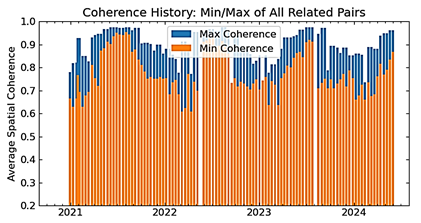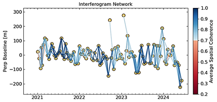 - text: includes interferogram dates, average coherence, and spatial baseline separation (see to Fig. 15). Deformation estimation is conducted via the unwrapping of the interferometric phase.