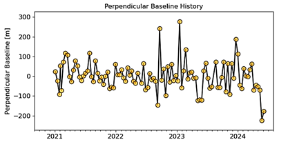 We performed a time series analysis utilizing Mintpy on the OpenSAR Lab server. The Mintpy toolbox is a Python 3 application designed for modest baseline InSAR time series analysis [19]. The input consists of a series of differential interferograms that create a completely interconnected network. Interferograms must be pre-unwrapped with minimal geometric perpendicular and temporal baselines to optimize their quality [20]. Modern SAR constellations with narrow orbital tubes and brief revisit intervals, like Sentinel-1, may readily establish a comprehensive network of interferograms [21] (Bonano et al., 2024). The input stack can be produced with, among other instruments, the Interferometric SAR Scientific Computing Environment (ISCE) [22]. The primary stages of interferometric processing executed by ISCE include orbit correction, de-bursting, co-registration, interferogram creation, adaptive filtering, topographic phase subtraction utilizing a provided Digital Elevation Model (DEM), and two-dimensional (spatial) unwrapping [23].