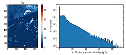 Where warp is an operator that constrains the input number to the interval [-π, π]; T is the quantity of interferogram triplets. As previously stated, errors must be eliminated through the investigation and eradication of unaddressed discrepancies. Figure 19 presents a histogram depicting the frequency of triplets exhibiting non-zero integer ambiguity. The key insights derived from the Tint map and histogram are as follows: