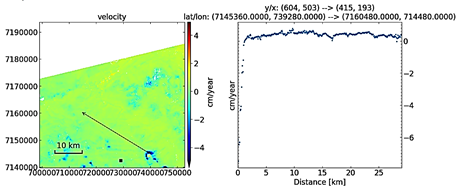 To determine displacement, a velocity graph must be constructed. The min/max values in this figure require adjustment to align with our previous data set. The results depicted in figures 20 and 21 illustrate the data range previously addressed about coherence and baseline adaptation. This graphing can be performed initially to gather information and subsequently re-executed to implement adjustments. We revised the Vmin and Vmax to align with our data range. The assigned Vmin and Vmax values may also be utilized for supplementary graphs. In the colour scale of these displacement/velocity charts, green signifies zero deformation, whilst blue indicates deformation below zero. In Figure 20 below, the blue areas indicate the area of concern with documented displacement. Figure 21 illustrates a total vertical displacement of 200 cm and a lateral displacement of 310 cm. The coordinates of the impacted region are (7145360, 739280) and (7160480, 714480) correspondingly.