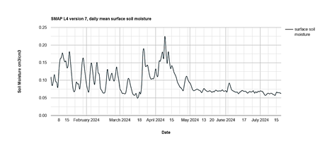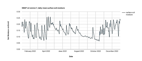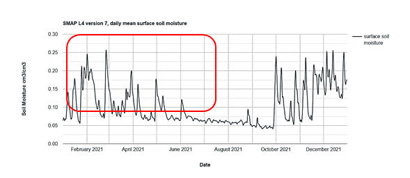 Soil Moisture Active Passive (SMAP) is a metric utilized to measure soil moisture. The SMAP project is a global orbiting observatory that quantifies the water content in surface soil. Soil moisture is an essential indicator in agriculture, drought and flood forecasting, weather forecasting, and other domains [6]. SMAP quantifies the water content in the upper 5 cm of soil over all terrestrial regions that are neither frozen nor submerged in water. Furthermore, it differentiates between frozen and thawed soil. SMAP analyzes the moisture content within the minerals, geological materials, and organic particles found in soil globally, specifically in regions where the ground remains unfrozen [8]. SMAP cannot detect ice, but it can assess liquid water in the uppermost layer of the Earth [9]. The soil's moisture content influences the emission of microwave radiation, although this energy exists in all soil types [10]. Microwave energy escalates with arid soil and diminishes with moist soil. This radiation is quantified using radiometers, enabling scientists to ascertain the water content [11]. SMAP measures radiation in the L-band microwave spectrum (30–15 cm & 1-2 GHz frequency), as this wavelength may penetrate clouds, enabling SMAP to assess soil moisture under cloudy situations [12].