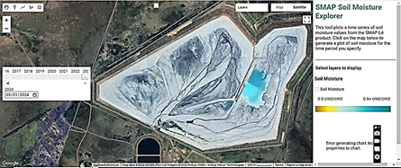 The soil moisture analysis was performed from 2020 to 2024. An assessment of the water content in the surface soil was conducted. SMAP quantified the water content in the uppermost layer (5 cm) of soil. It was determined to average 0.09 cm³/cm³ due to the ashing and the associated damming required by the ashing process. The researchers choose the dam facility as their focal point on the SMAP visualization application, as illustrated in Figure 2.