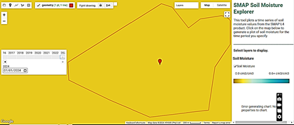 The researchers selected the soil moisture tab for viewing and analyzed the generated results by adjusting the zoom level of our study region. Upon selecting the stop drawing tab and clicking on the map to display the soil moisture value, the researchers obtained a measurement of (0.09 cm3/cm3) in this instance (see fig.4). Figure 3 (highlighted in red) indicates that any value beyond 0.6 cm³/cm³ is deemed worrisome.