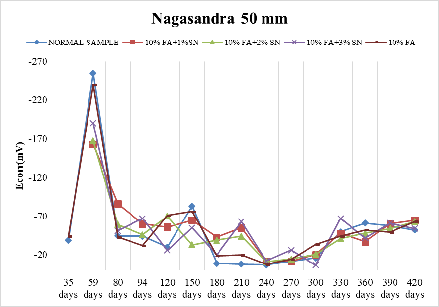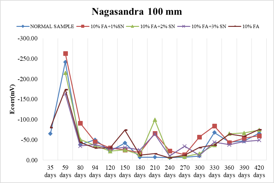 Abstract - The corrosion of steel reinforcement in concrete, often caused by carbonation and chloride ingress, poses a significant threat to the durability of reinforced concrete structures. The use of secondary treated wastewater (STW) in concrete has emerged as a sustainable alternative to potable water, though its residual contaminants—such as chlorides and dissolved solids—raise concerns about increased corrosion risk. This study investigates the corrosion behavior of M30-grade concrete made with STW, incorporating 10% fly ash as a partial cement replacement and sodium nitrite at 1%, 2%, and 3% (by cement weight) as a corrosion inhibitor. Using the half-cell potentiometer method in accordance with ASTM C876-15, corrosion activity was monitored over 14 months. Concrete specimens with 50 mm and 100 mm cover depths were prepared using STW from three Bangalore treatment plants: Bellandur, Jakkur, and Nagasandra. Results revealed that sodium nitrite, particularly at 1% and 2%, significantly reduced corrosion risk, with half-cell potentials remaining above -200 mV—indicating a low probability of corrosion. A 100 mm cover depth provided better protection than 50 mm. Despite initial corrosion susceptibility due to STW contaminants, the use of fly ash and inhibitors effectively mitigated the risk. By the end of the study, corrosion performance was comparable to concrete made with potable water, supporting STW’s feasibility in sustainable construction