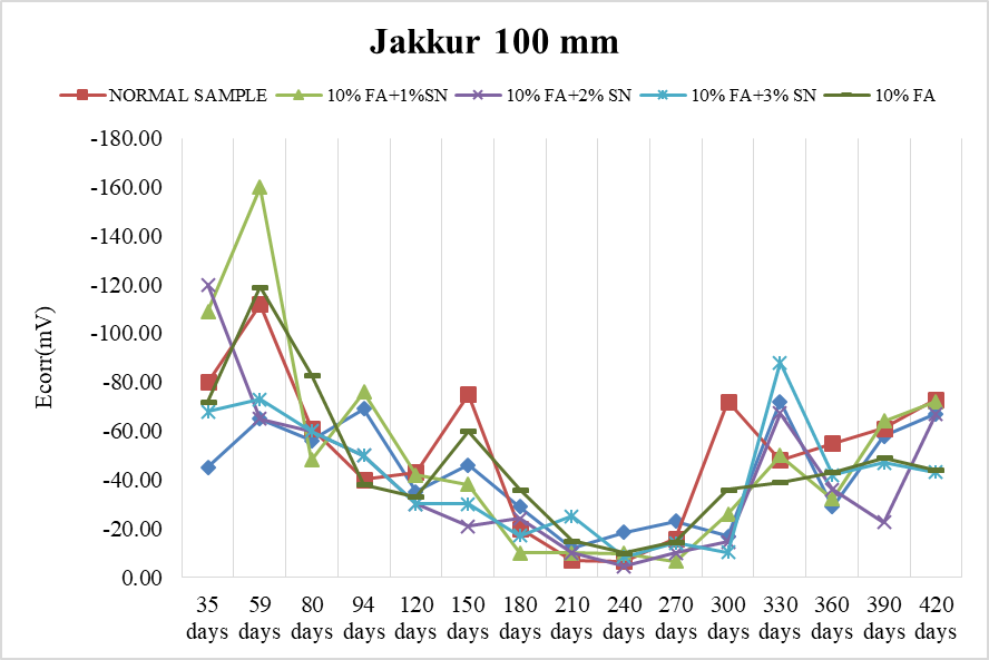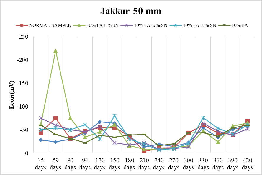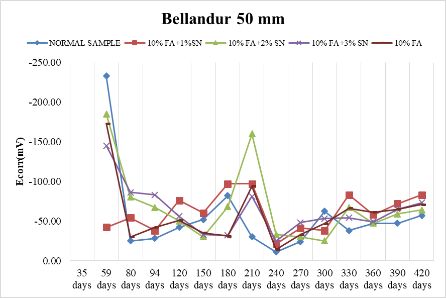 - Effectiveness of Sodium nitrite: Sodium nitrite concentrations of 1% and 2% by weight of cement were the most effective in maintaining corrosion potential values above -200 mV, indicating a low likelihood of corrosion. At a 3% concentration, the performance was inconsistent, suggesting that higher sodium nitrite levels may not yield proportional benefits.