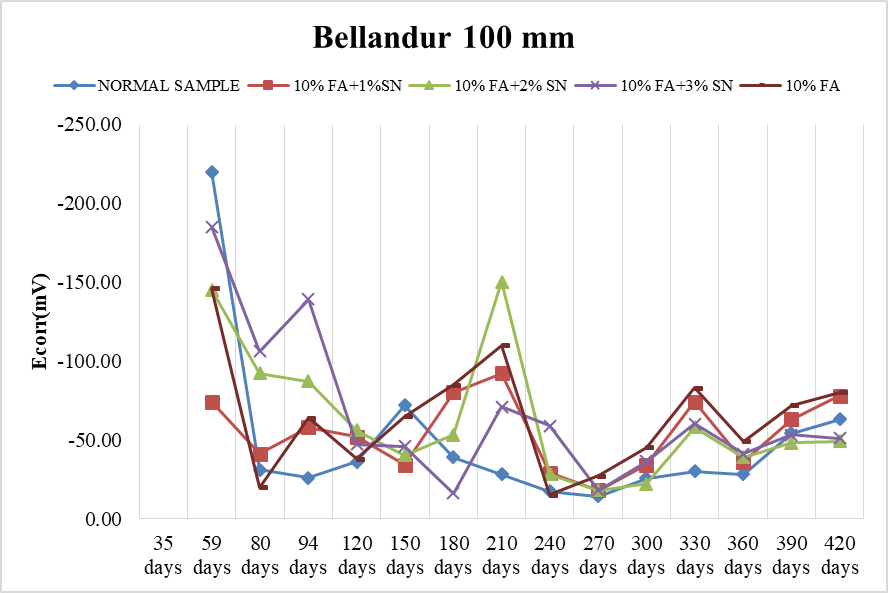 The half-cell potentiometer test results provided valuable insights into the corrosion potential of steel reinforcement in concrete made with secondary treated wastewater, incorporating 10% fly ash as a partial cement replacement and varying sodium nitrite (1%, 2%, and 3% by cement weight) as an accelerating admixture. The electrochemical potentials measured indicated variations in corrosion activity across the samples.