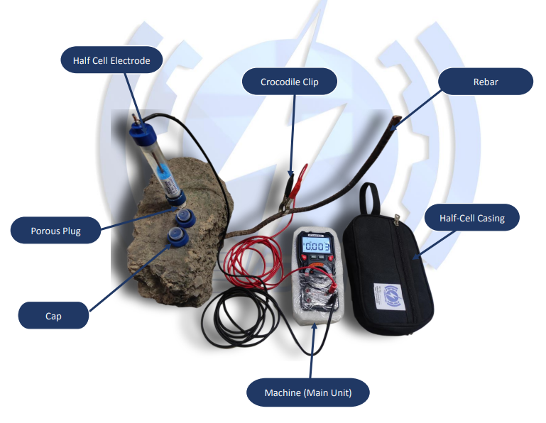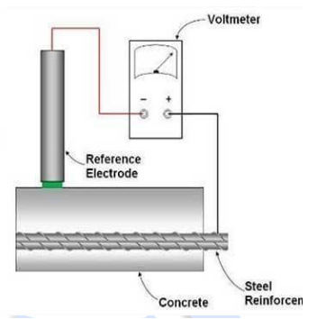 Exposure to elements such as carbon dioxide (CO₂) or chlorides can initiate corrosion, potentially compromising the concrete and reaching the steel reinforcement embedded within. Utilizing an accurate and dependable technique to evaluate corrosion is essential, as it plays a critical role in ensuring the structure's longevity and structural integrity. The Half-Cell Potential test, governed by standards ASTM C876-15 and IS-516, is widely acknowledged as a fundamental method for detecting and monitoring corrosion activity. Fig 1 depicts the configuration and working of a Half-Cell Potentiometer employed for this assessment.