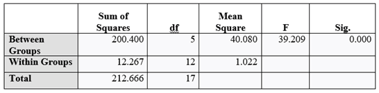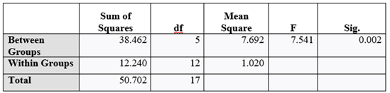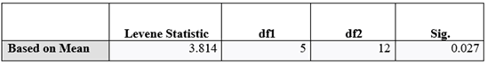 A homogeneity of variance test was conducted to determine whether the variances of the treatments could be assumed equal. Table 3 presents the results, showing a significance value (p = 0.027), which indicates a violation of the homogeneity assumption. Therefore, Welch’s ANOVA was performed alongside the one-way ANOVA.