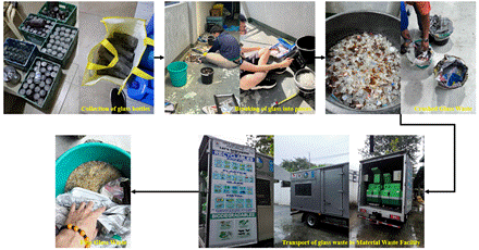 The materials used in producing the geopolymer concrete were ordinary Portland cement (OPC), sand, gravel, Class F fly ash, and glass waste. The OPC, sand, gravel, and fly ash were purchased from a local construction supplier. Meanwhile, soda-lime glass bottles were collected from local junk shops and eateries. The bottles were first crushed for easier transport, then pulverized using a waste shredder at the Manila City Material Recovery Facility to produce the required glass waste (see Figure 1). The resulting glass waste had a grain size similar to fine sand.