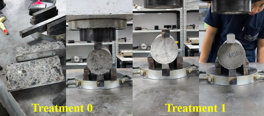Similar to the compressive strength test, the data gathered from the split tensile test following ASTM C496 were first evaluated according to ASTM C670. According to ASTM C496 and ASTM C670, the coefficient of variation of three results in a treatment is suggested not to exceed 16.5%. All treatments passed the precision check and were ready for data evaluation.
