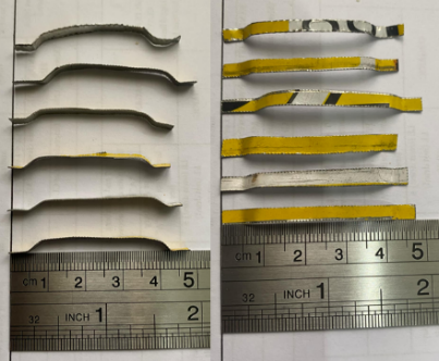 The researchers collected waste cooking oil cans made of steel from restaurants within Metro Manila, Philippines. The collected cans were washed and dried, then transported to a local construction company, Fundamentum Construction, for cutting. Figure 2 shows the recycled steel can fibers produced. A hook-end configuration was used to provide an interlocking mechanism. The thickness of the recycled steel can fibers was 3 mm.
