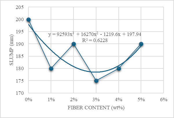 When recycled steel can fibers were added, slump values decreased and fluctuated, as shown in Figure 3. The lowest slump value (175 mm) was observed in treatment 3. The cubic regression, with an R² value of 0.6228, indicates a decreasing trend until treatment 3, followed by an increasing trend through treatment 5. All fiber-reinforced treatments had lower slump values than the control group. This reduction suggests lower workability as fiber content increases, consistent with observations in earlier studies on fiber-reinforced concrete [12], [13], [14], [15], [16], [23]. Mishra [23] also highlighted slump reduction as a consideration in FRC design. The fluctuations in slump may have resulted from variations in the quantity and quality of the materials used.