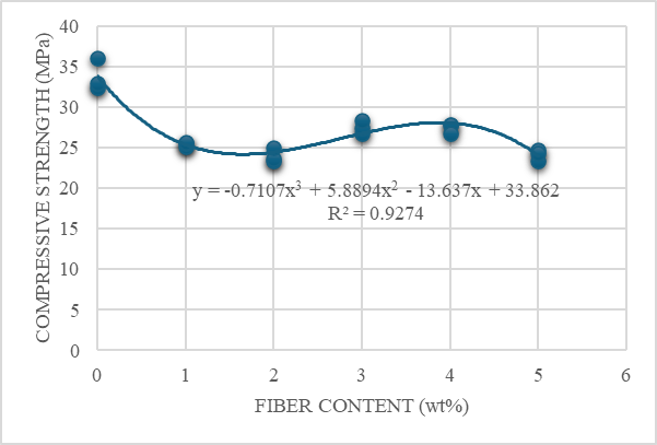 As shown in Figure 4, the cubic regression (R² = 0.9274) revealed an initial decrease in strength with fiber addition. Treatment 2 (2% fiber content) had the lowest mean compressive strength (24.01 MPa). Strength increased again at treatment 4 (4% fiber content), which reached the highest value among fiber-reinforced mixes (27.54 MPa), before decreasing at treatment 5.