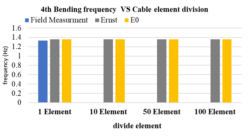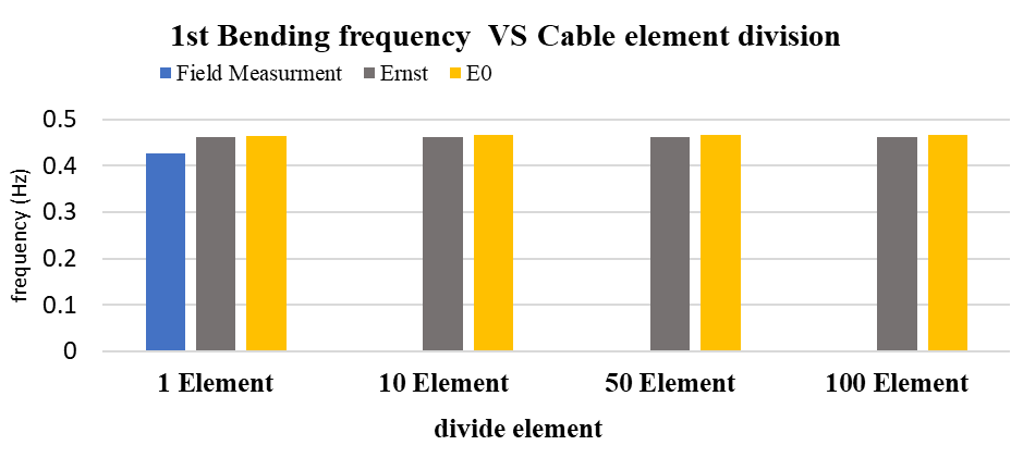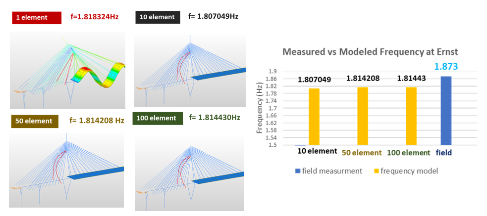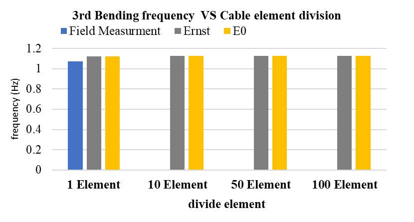 These results show that finer cable discretization improves modal accuracy by better representing curvature and flexibility. The slight frequency increase reflects reduced artificial stiffness in coarse models, while convergence beyond 50 elements indicates sufficient refinement to capture the cable’s true dynamic behavior.