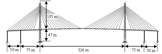 The target bridge of this study is the Bhumibol Bridge I, a cable-stayed bridge crossing the Chao Phraya River in Bangkok, Thailand (Figure 2). Opened in September 2006, it consists of a 326 m composite main span and 125 m post-tensioned concrete box girder side spans. The deck is supported by two 152 m-high diamond-shaped reinforced concrete towers and four side-span piers. Fixed connections between the deck, towers, and piers are made of homogeneously stressed concrete, with expansion joints provided at both ends of the side spans.