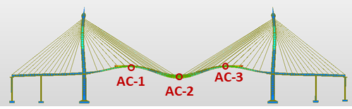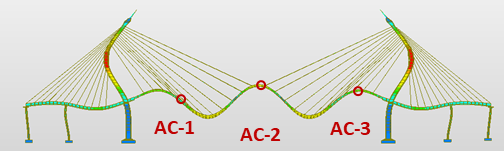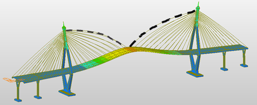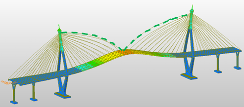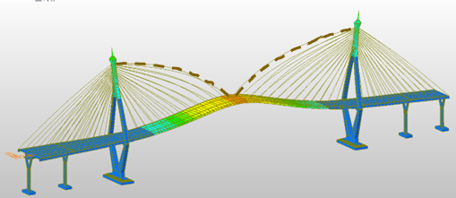 A detailed finite element model (FEM) of the Bhumibol Bridge I was developed from design drawings, focusing on stay cables that govern global stiffness and vibration behavior. The baseline model used single truss elements per cable, while refined models with 10, 50, and 100 elements captured curvature and higher vibration modes. The Ernst effective modulus represented effect and precamber was incorporated into the deck geometry to reflect the initial cambered configuration during construction. Free vibration tests under ambient traffic and wind provided field data for calibration. The final FEM was validated against measured natural frequencies, mode shapes, and static responses.