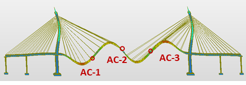 These responses are highly nonlinear, mainly due to geometric nonlinearity caused by cable sag and large displacements, as well as material nonlinearity related to variations in axial tension and stiffness [8]–[10]. Since stay cables act as tension-only elements, their natural frequencies are strongly influenced by the axial force, self-weight, and unstrained length [11]. The vibration modes of cable-stayed bridges can generally be classified into three categories: [2] global modes representing the collective motion of the deck, pylons, and cables; [3] local cable modes dominated by the vibration of individual cables; and [4] hybrid modes that involve coupled motions between global and local components [12], [13].