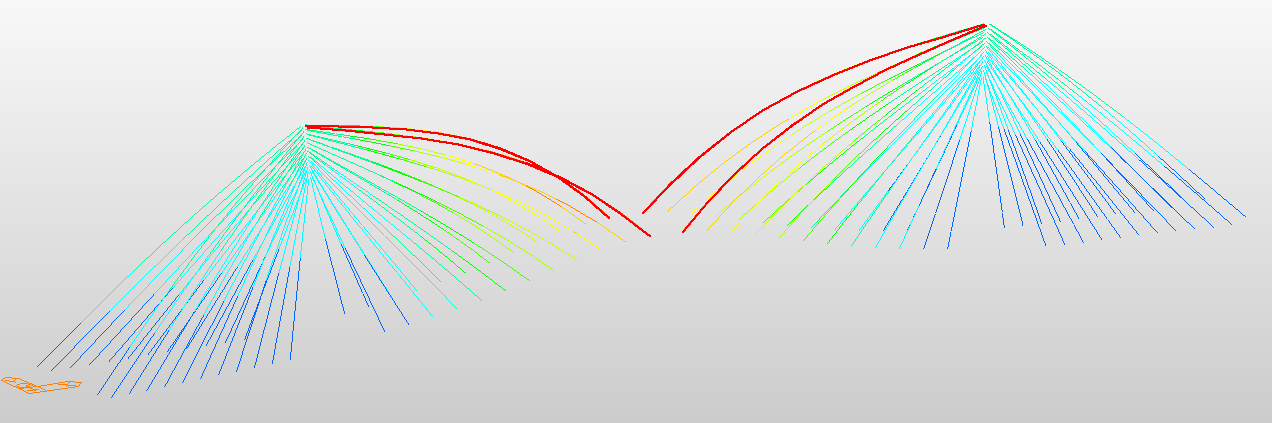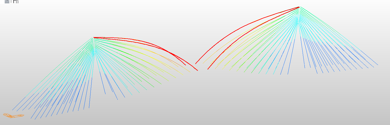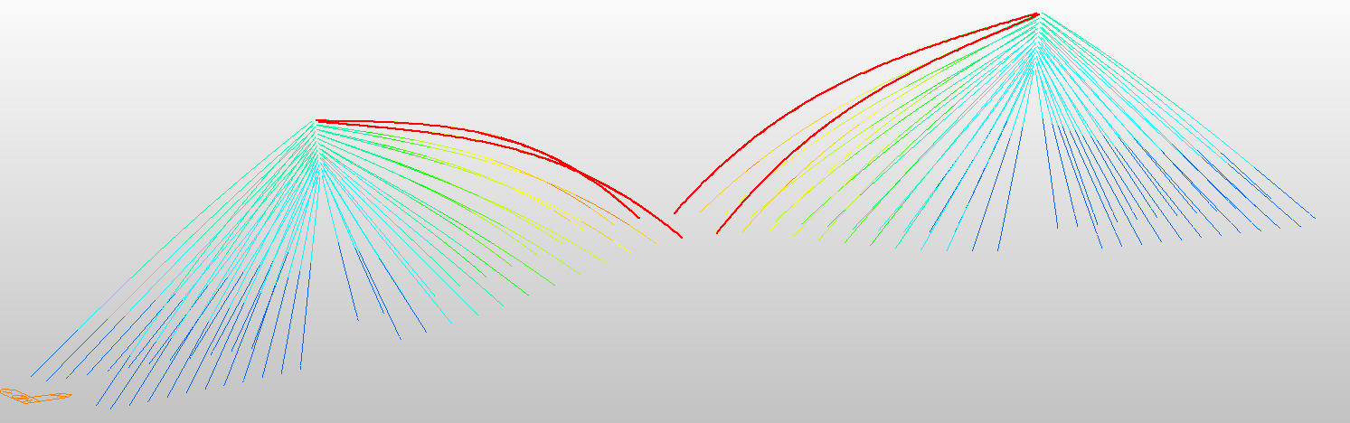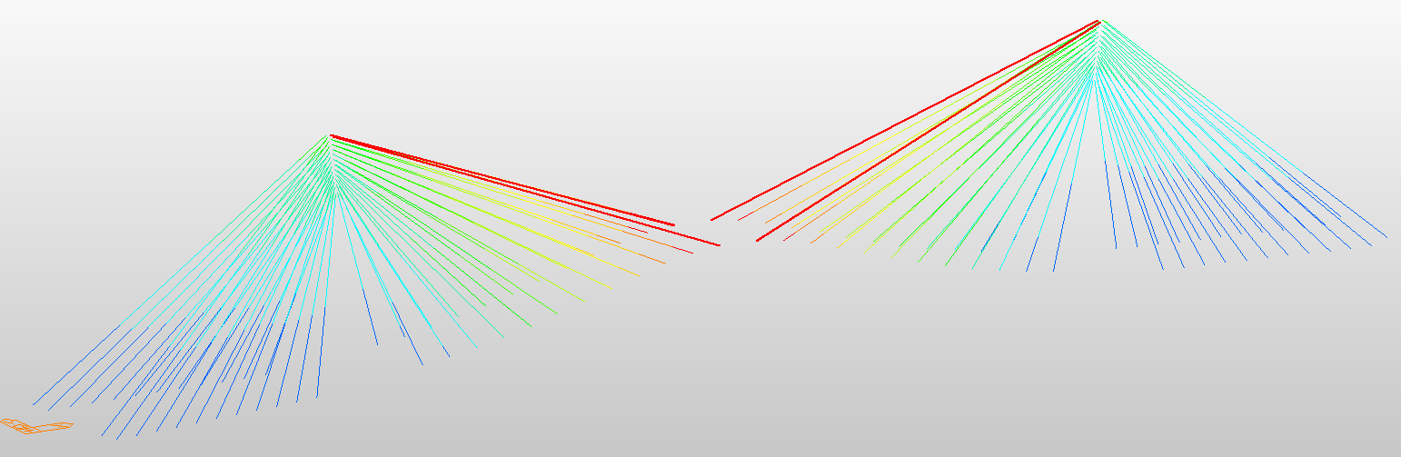 In the finite element model, stay cables were modeled as tension-only elements. Eight scenarios were analyzed to examine the effects of discretization and sag (Table 3). Two approaches were used: the linear elastic modulus (E₀) without sag correction and the Ernst effective modulus (Eᵣₙₛₜ) accounting for sag-induced stiffness reduction (Eq. 1). Each cable was idealized as a straight line between anchorage points (see Figure 3).