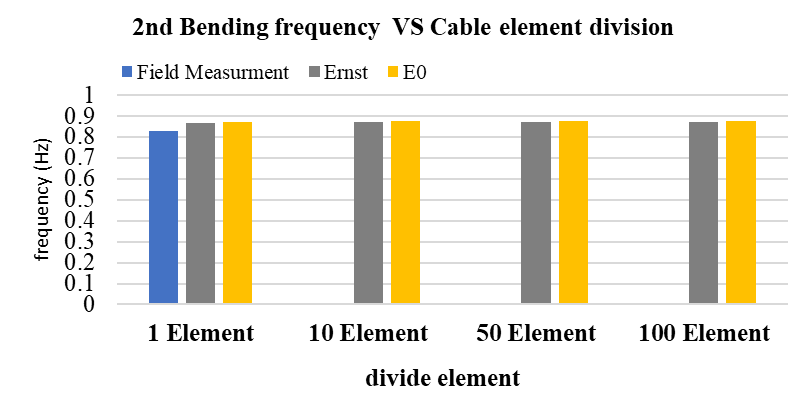 A similar trend is observed for the first modal frequency of cable where the overall frequency decreases with increasing cable length. Increasing the number of cable elements slightly raises the frequencies in both girder- and cable-dominated modes. However, for the second mode of long stay cables, the frequencies remain nearly constant beyond 50 elements, while the mode shape patterns become smoother.