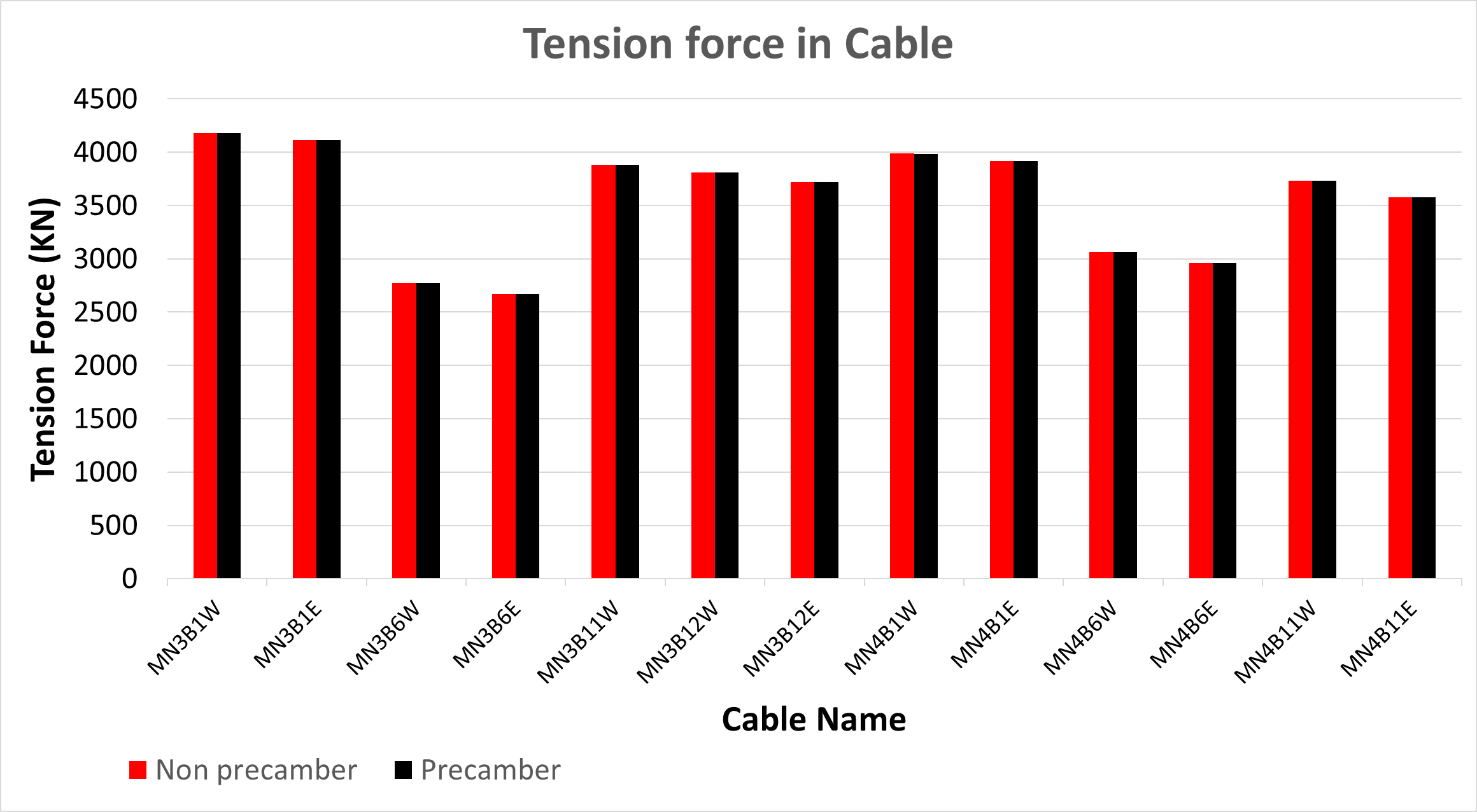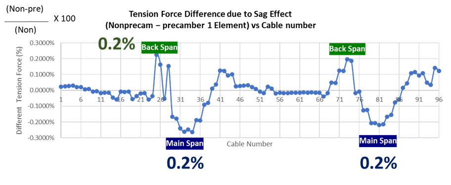 Figure 15 Tension force distribution in cables with and without precamber using the Ernst-modified modulus.