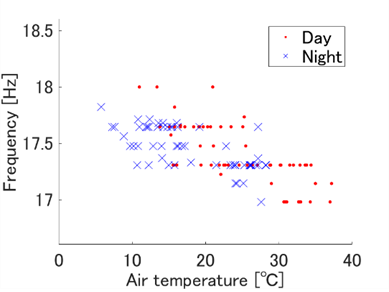A linear regression analysis was performed on all 118 identified natural frequency data sets with respect to temperatures. As a result, an increase of 1℃ in air temperature led to a decrease of 0.021 Hz in the first bending mode and 0.024 Hz in the first torsional mode. This behaviour is due to the influence of temperature variations on the physical properties of the concrete composing the bridge.