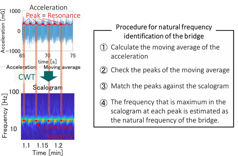 Since conventional FFT analysis is generally unsuitable for identifying natural frequencies during motion, a resonance-based method was adopted. As shown in Figure 16, the moving average of acceleration data from the dolly was computed, and peaks corresponding to resonance between the dolly and the bridge were extracted. These peaks were then mapped onto the resulting scalograms obtained from the Continuous Wavelet Transform (CWT), enabling the identification of the natural frequencies of the bridge.