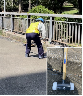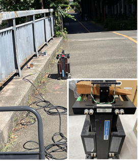 The shaker test involved six 2-minute upward sweeps from 5 Hz to 60 Hz. In the impact excitation test, the bridge was struck 10 times at the center and at 1/4 of the span, where the data was analyzed by connecting the data obtained 10 seconds after each excitation. For the constant microtremor test, data collected over approximately one hour was analyzed. Figure 3 and Figure 4 show the shaker test and the impact excitation test, respectively.