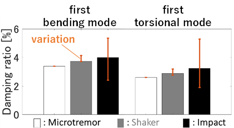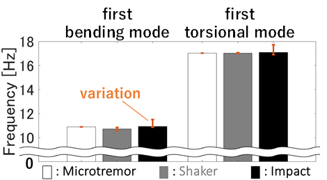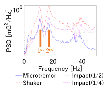 Three types of excitation tests were conducted: a shaker test, an impact excitation test, and a constant microtremor test.